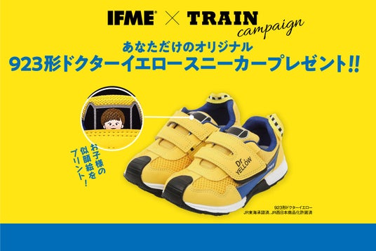 様々な新幹線・電車とのコラボレーションシューズを展開する、『IFME×TRAINシリーズ』。IFMEの機能性はそのままに、車両の特徴を落とし込んだデザインで、2020年の発売から、多くのお子様たちに愛用されてきました。この度、ファンの子どもたちへの感謝を込めて、シリーズの中でも人気の高い「923形ドクターイエロースニーカー」に、似顔絵イラストが入った世界に一つだけのオリジナルスニーカーの当たるキャンペーンを開催いたします。