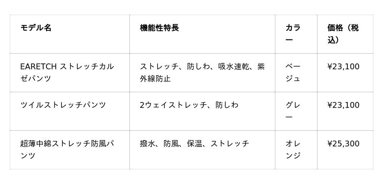 今回発売する3モデルは、中空糸素材「EARETCH(R)(エアレッチ)」を使用し、秋の寒暖差に対応する「EARETCH ストレッチカルゼパンツ」、ウールライクな上品な風合いが特徴の「ツイルストレッチパンツ」、そして真冬でも暖かく動きやすい「超薄中綿ストレッチ防風パンツ」の3種です。