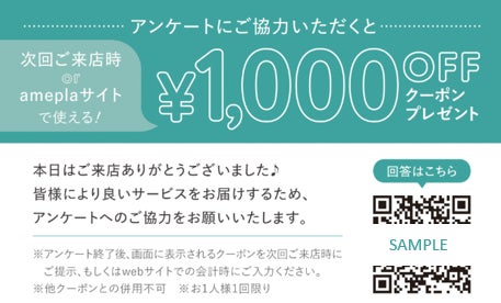 アンケートのご協力で1,000円OFFクーポンプレゼント店舗で商品購入時にお渡しするアンケートカードからアンケートにご回答いただくと、次回ご来店時もしくはameplaサイトで使える1,000円OFFのクーポンをプレゼントします。