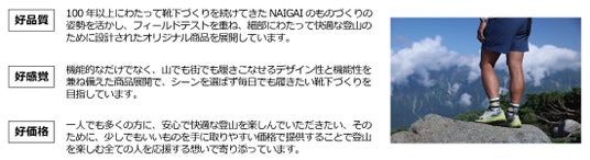 NAIGAI TRAILのアイテムは、山を愛するスタッフ自身の足で歩いた経験から生まれました。靴下、帽子、タオル、ネックウォーマーなどひとつひとつのアイテムが現場の実感をもとに考えられ作られています。