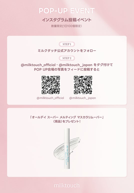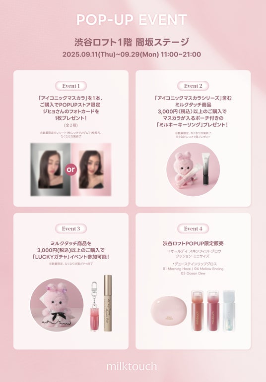 TWICE JIHYOがミューズを務める韓国コスメブランド「milktouch」が新商品「アイコニックマスカラ」の発売を記念したPOP-UP STOREを2025年9月11日より開催。