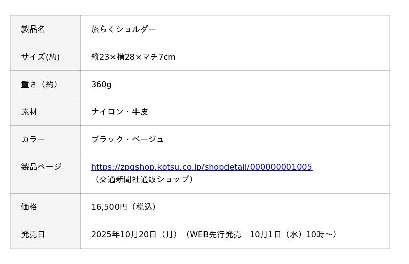 株式会社交通新聞社(本社:東京都千代田区/代表取締役社長:伊藤嘉道)が運営するECサイト「交通新聞社通販ショップ」では、オリジナル商品として、新たにショルダーバッグ「旅らくショルダー」を発売します。