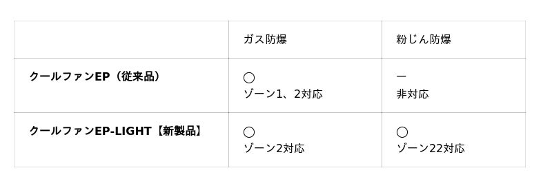 に区分され、危険度の高いゾーンに対応する機器は、より広い範囲のゾーンで使用できます。この設計により、最大風量55 L/sの高出力を維持しつつ、従来品「クールファンEP」と比較して大幅なバッテリー軽量化を実現しました。ゾーン1対応が必要な環境では、従来品「クールファンEP」をご使用ください。両製品を使い分けることで、幅広い防爆環境をカバーできます。