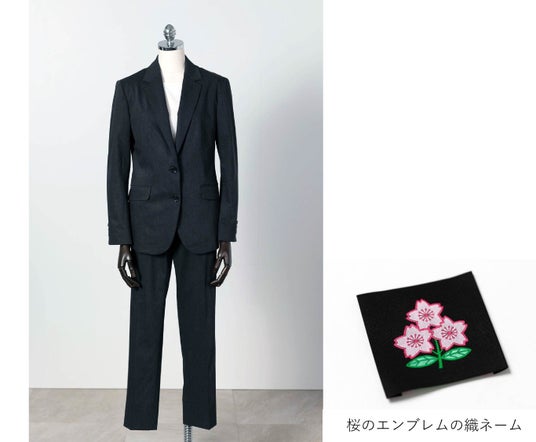 着心地の良さをコンセプトに、ストレッチ性、軽量性、ウォシャブルを特長とする“快適さと機能性”を両立した「KASHIYAMA EASY(カシヤマ イージー)」を採用しました。ジャケットは、シングル2釦センターベントで動きやすさを向上させ、スタイリッシュなシルエットを提案します。また、ジャケットの内側には桜のエンブレムが刺繍された織ネームを施しディテールにもこだわりました。パンツはテーパードシルエットを使用し、腰まわりや太ももにゆとりを持たせ、快適なはき心地と動きやすさを実現しています。さらに、膝から裾に向かって細くなるデザインは、脚全体をすっきりと見せる効果があります。