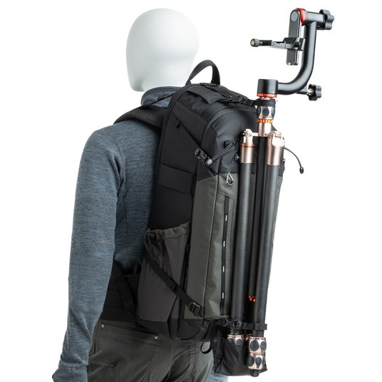 バッグにはトライポッドストラップが付属し、前面または左右のサイドポケットに三脚を固定できます。
