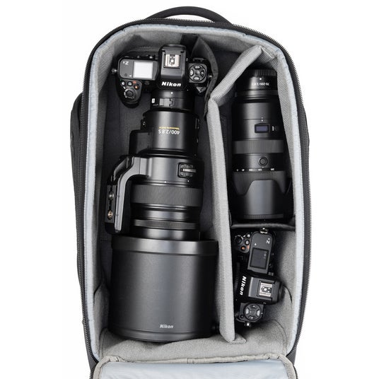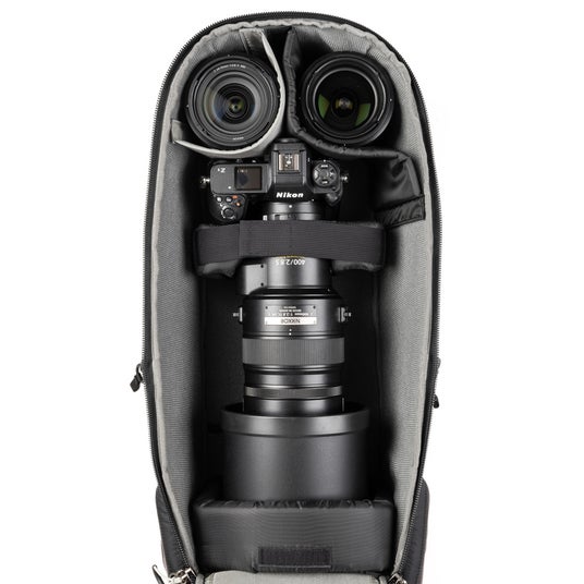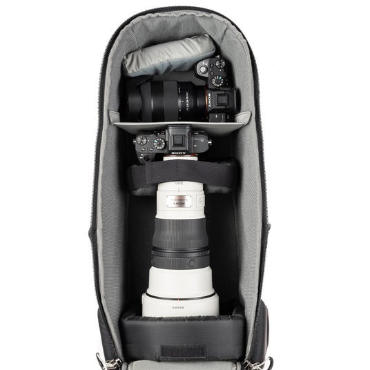 テレコンバーターやアダプターを付けた超望遠レンズ(最大600mm F4 または 800mm F5.6)を装着したグリップ付き一眼レフを収納できるバッグです。奥行きがあるため、大型のレンズフード(直径8インチまで)の収納や、短いレンズのスタックにも対応しています。