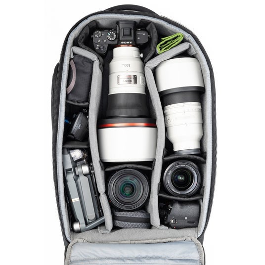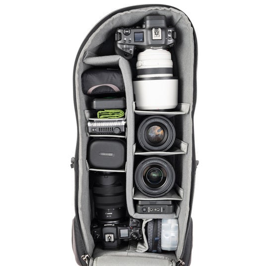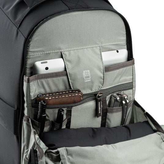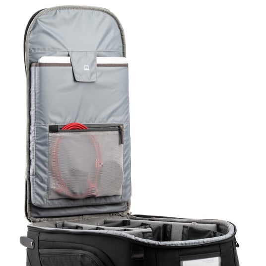 バッグは自立し、垂直に立てた状態でも横にした状態でも、大きく開くバックパネルからメインコンパートメントへアクセスでき、ハーネスを汚しません。バックパネル裏側にはジッパー付きポケットが2つあり、ケーブルやバッテリー等の収納に役立ちます。