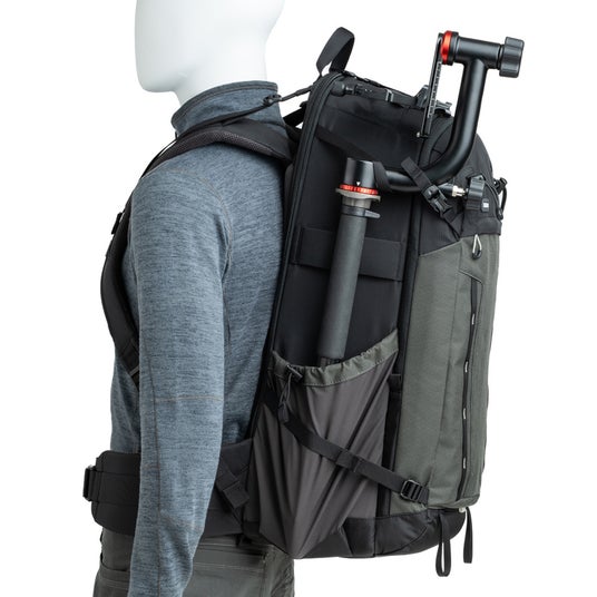 バッグの両サイドにはシンクタンクフォト製のポーチ(別売り)などを取り付けられるアタッチメントを装備。ショルダーストラップとフロントにはデイジーチェーンやトレッキングポール / アックス用ループが設けられ、持ち運べる荷物の容量を拡張できます。