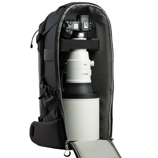 「バックライトロングレンズ」は、600mm F4や800mm F5.6等の超望遠レンズを装着したグリップ付き一眼レフやケージ付きの一眼レフを収納できる、ネイチャーフォトグラファー向けのカメラバックパックです。革新的なバックパネルの開口部により、バッグを垂直に立てた状態でも寝かせた状態でも機材にスムーズにアクセスできます。