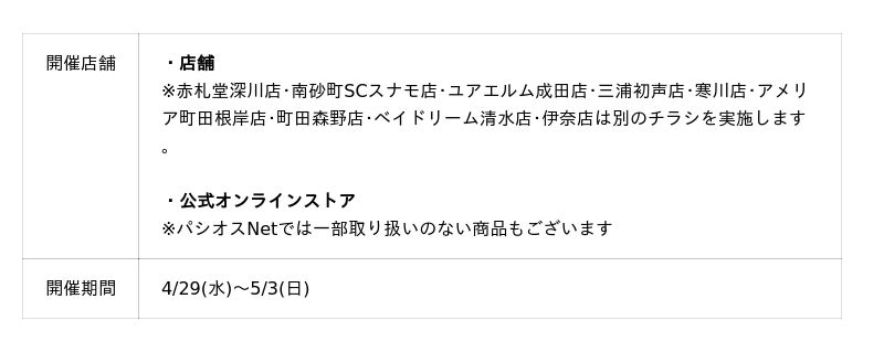 公式オンラインストア パシオスNetでは新規会員登録でのクーポンプレゼントや店舗受取サービスなど、様々な特典をご用意しております。(https://www.paseos-net.com/)