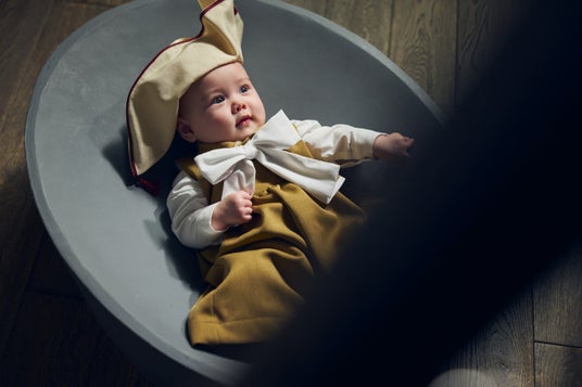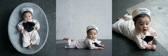 モノトーンを基調に、セーラーハットと首元の大きなリボンが写真に映える衣装。 寝転んでも心地よく過ごせるよう、帽子の素材やバックリボンの長さなど工夫を凝らしています。