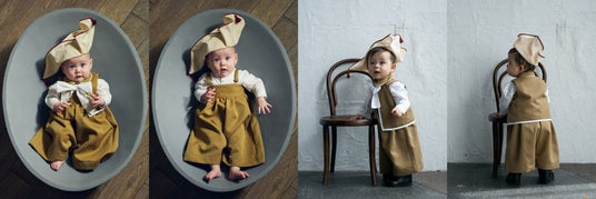 ヴィンテージ調のオークカラーで、子どもたちの可愛らしさに品を添えてくれるジェンダーフリーな衣装です。