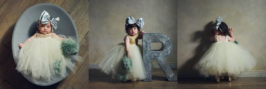 抱っこの際は大人の腕でトレーンが美しく流れ、特別な瞬間をドラマティックに演出します。