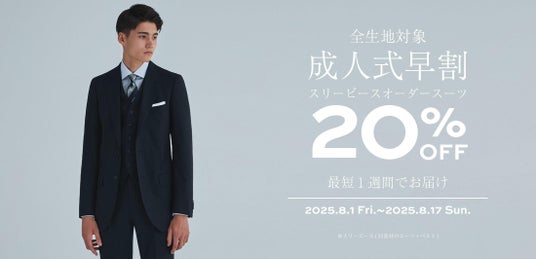 キャンペーンでは、通常価格¥44,550(税込)のスリーピーススーツを20%OFFの¥35,640(税込)から購入できます。対象者は成人式を控える全国の新成人としており、『KASHIYAMA』の全店舗で購入が可能です。キャンペーンの詳細は「成人式早割 | スリーピースが20%OFF」キャンペーンページをご確認ください。