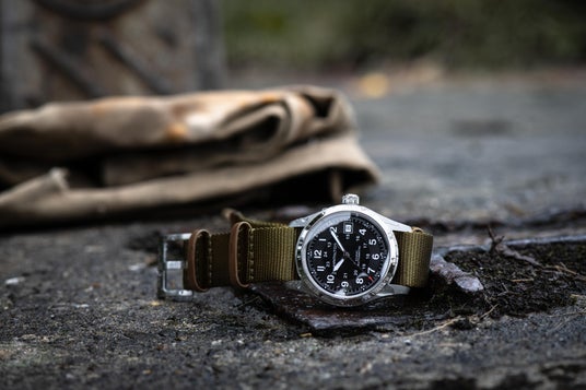 堅牢なステンレススチール製ケースにブラックダイヤルを組み合わせ、暗闇でも視認性を確保するスーパールミノバ(R)加工の針を採用。耐久性に優れたカーキグリーンのNATOストラップがタフな印象を強調し、内部には最大80時間のパワーリザーブを誇るH-10自動巻きムーブメントを搭載。過酷な状況下でも確かな信頼性を発揮します。