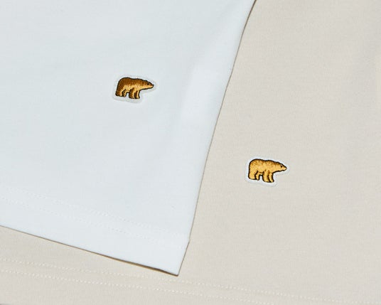 跳ねるホースから「Golden Bear」のロゴが噴きだす、夏にぴったりな爽やかなモチーフを描いていただきました。どんなコーディネートにも合わせやすいよう、ベーシックな2色展開です。