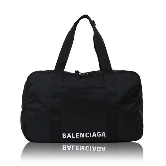 軽量なブラックのファブリック素材を用いたダッフルバッグです。フロントには白い「BALENCIAGA」ロゴが大きく横書きでプリントされ、ブランドのアイデンティティを主張しています。ジッパー開閉式で、荷物を安全に収納可能。幅広のトップハンドルは持ち運びやすく、日常使いからジム、旅行まで、幅広いシーンで活躍する機能的でスタイリッシュなデザインが魅力です。