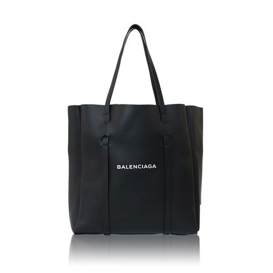 バレンシアガのエブリデイトートは、シボ加工が施されたブラックレザーに、「BALENCIAGA」ロゴが大胆に配されたトートバッグです。細身のトップハンドルとオープンな開口部が特徴で、シンプルながらもモダンでクリーンな印象を与えます。普段使いにぴったりのサイズ感と、どんなスタイルにも合わせやすいミニマルなデザインが魅力で、日常の必需品をスマートに持ち運べます。