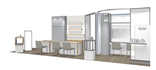 「ラボ(研究所)」をイメージしたデザインの個室キャビンで、「ドモホルンリンクル」全製品(*一部除外)をじっくり体感することも可能です。漢方発想を元に選び抜かれた原料が、そのイメージを象徴するような形でディスプレイされており、製品へのこだわりとともに"極上のスキンケア体験”による肌の仕上がりの手応えを”五感”で楽しめます。