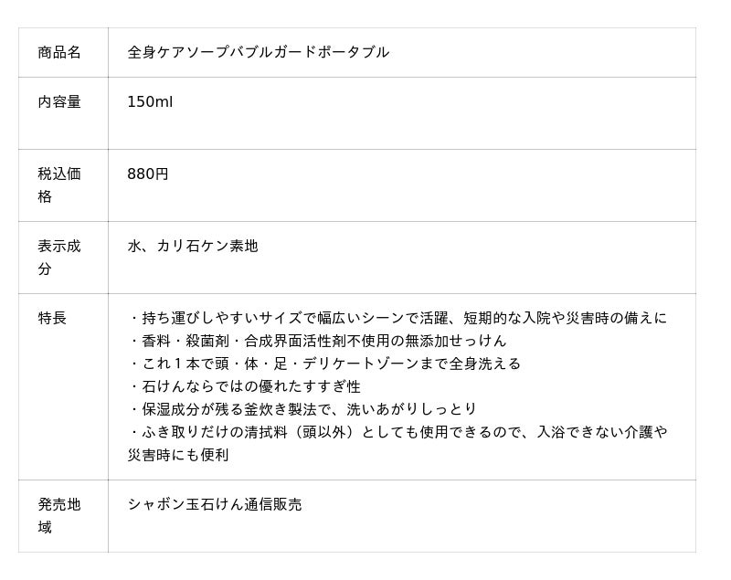 現行の全身ケアソープバブルガード(570ml)は、容量が大きく自宅での使用が中心でしたが、商品の汎用性から、「携帯用サイズがあれば使ってみたい」とのお客様の声をいただき、この度携帯用サイズを発売いたしました。香料・殺菌剤・合成界面活性剤不使用の無添加石けんです。釜炊き製法により保湿成分が残り、しっとりとした洗いあがりはそのままに、幅広い用途でご利用いただけます。荷物を減らしたい旅行やアウトドア、運動後をはじめ、出産などの短期的な入院や介護、災害などの緊急時への備えなどにも最適です。災害時においては、水がなくてもふき取りでの使用が可能なため、水資源に限りのある場合の衛生管理にも安心です。また、自然由来の原料から作られた石けん成分のみを使用して