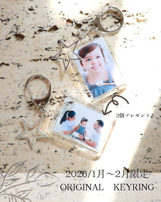 東京・目黒区のライフスタジオ自由が丘店では、2026年1月4日~2月28日の期間中、ご来店になったお客様全員に、成長の記念にもぴったりな オリジナルフォトキーリングを2個プレゼント するイベントを実施