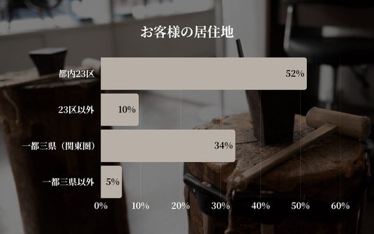 今月のご利用者様の居住地を集計した結果、「都内23区」が52%と過半数を占め、最も多い層となりました。次いで「一都三県(関東圏)」が34%と続き、都内および首都圏在住のお客様で全体の86%を構成するという結果となりました。一方、「23区以外」は10%、「一都三県以外」は5%となっており、遠方からも一定数のお客様にお越しいただいていることが分かります。