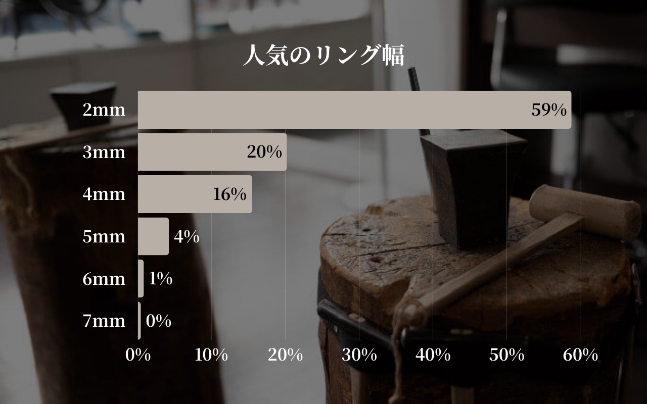 今月の人気リング幅の集計では、「2ミリ幅」が59%と過半数を大きく超える支持を集め、引き続きトップの座を守る結果となりました。「3ミリ幅」が20%でこれに続き、細身の2ミリ・3ミリ幅だけで全体の79%を占めるという結果となっています。