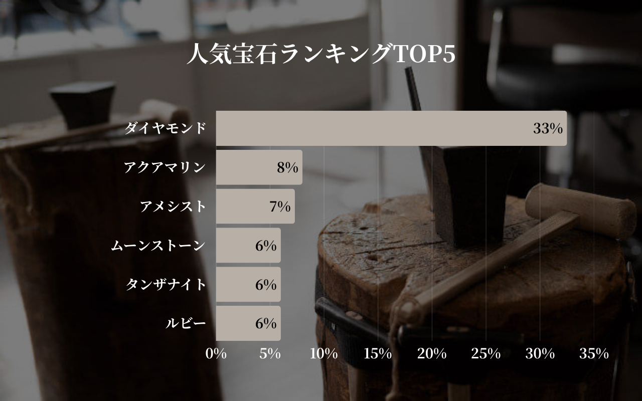 2位以降は、アクアマリン(8%)、アメシスト(7%)と続き、ムーンストーン・タンザナイト・ルビーがそれぞれ6%で並ぶという結果となりました。前回のランキングと顔ぶれが変わり、今月はアクアマリンとタンザナイト、ルビーが新たにランクインしたことが注目ポイントです。アクアマリンは「幸福な結婚」を意味する石として知られており、パートナーへの想いを込めた選択として選ばれているケースが多いと推察されます。またルビーは情熱や愛の深さを象徴する石として、特別な記念日のペアリングにふさわしい一石として支持を集めたと考えられます。