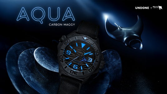 2025年6月 - カスタマイズ腕時計ブランド「UNDONE(アンダーン)」はこのたび、英国の海洋保全団体「Manta Trust(マンタ・トラスト)」との正式なコラボレーションにより、新作ダイバーズウォッチ「Aqua Carbon Maggy(アクア・カーボン・マギー)」を発売いたします。