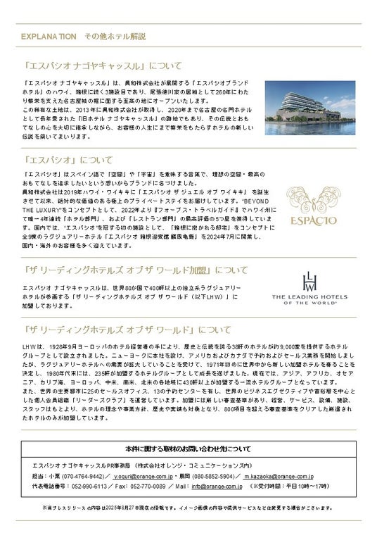 エスパシオ ナゴヤキャッスルは、時代を超えて受け継がれてきた「旧ホテルナゴヤキャッスル」の伝統とおもてなしの心を継承しながら、お客様にとって記憶に残るホテルステイを実現するため、魅力的なコンテンツやサービスの充実化を引き続き図ってまいります。