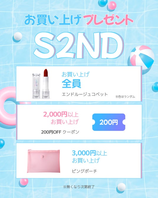 S2ND Qoo10メガ割ではお買い上げプレゼントもあり価格によって多様なプレゼントがもらえます。S2NDのQoo10公式ショップでは05月31日(土)~06月12日(木)までの期間限定で最大60%OFF、またS2ND楽天公式ショップでも06月04日(水)20:00 ~ 06月11日(火)01:59までの期間限定で最大50%OF+10倍ポイントをもらえる企画を開催するので、この企画をお見逃しなく。