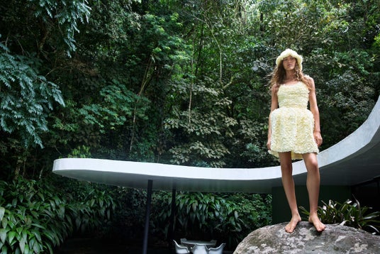 鮮やかな色彩がアクセントとなった自然なアースカラーのパレットは、自然と人間、青々としたエキゾチックな植物とリオデジャネイロのカサ・デ・カノアスのすっきりとしたラインとの対比として、背景にシームレスに溶け込んでいます。この建物を設計したオスカー・ニーマイヤーは、モダニズムのデザインと曲線を多用した革新的なフォルムで知られています。彼の特徴的なスタイルは、コンクリートを使用して流動的で有機的な形状を作り、建物を周囲の風景にシームレスに統合することです。カサ・デ・カノアス内に設置されたアルフレド・チェスキアッティとベラ・トーレスの彫刻も写真に納まっています。