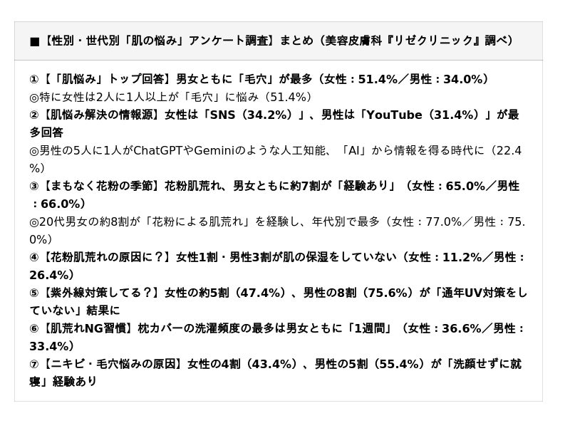 全国28院展開する美容皮膚科『リゼクリニック(男性はメンズリゼ)』(医療法人社団風林会/東京都新宿区、理事長:赤塚正洋)では、「肌悩み」がある10~50代男女1000名(各世代100名)を対象に【性別・世代別/「肌の悩み」に関するアンケート調査】を実施(対象期間:2026年2月2日~8日の7日間・インターネット調査)。ランキング形式でまとめました。