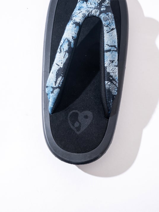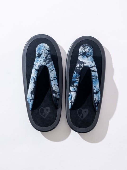 インディゴ絞りによるガラスパターン生地と、草履由来の構造を掛け合わせた特別仕様です。日常使いに適した実用性と、落ち着いた存在感を兼ね備えた一足に仕上げています。