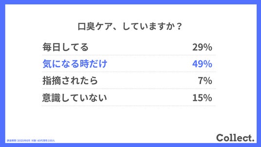 「毎日している(29%)」が3割を占めましたが、最多の「気になる時だけしている(49%)」「指摘されたら(7%)」「意識していない(15%)」など、ケア意識に大きな差が見られる結果となりました。