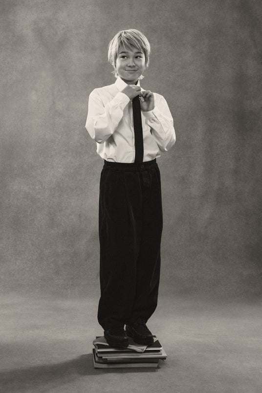 WOMAN(ウィメンズライン)では、流れるようなシルエットや柔らかなプロポーションでテーラリングを再解釈し、ノスタルジックでありながら現代的な色彩を取り入れています。MAN(メンズライン)は、構造性とリラックス感のバランスが特徴で、洗練されたカットや計算されたドレープにより、フォーマル素材を新たなアプローチで表現しています。KIDS(キッズライン)では親密さを前面に打ち出し、大月氏自身が幼少期に母親から手作りしてもらった洋服の記憶を想起させる温かみのある仕上がりとなっています。