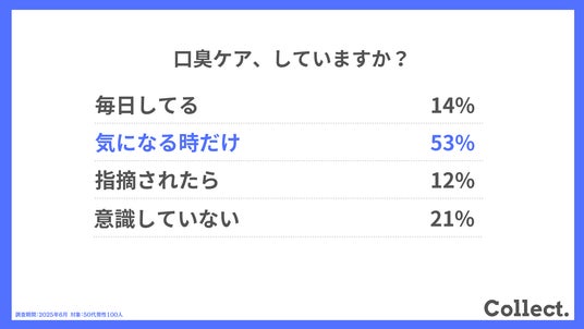 歯磨きとは対照的に、日常的に口臭ケアをしている人は少数派にとどまりました。エチケット意識が高まりつつある現代、口臭予防とホワイトニングを兼ねるオーラルケア商品の利用は積極的に考えたいところです。