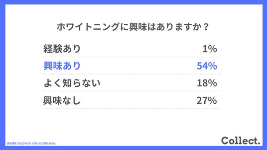 - ホワイトニングに「興味あり」は54%。実際の「経験者」はわずか1%。