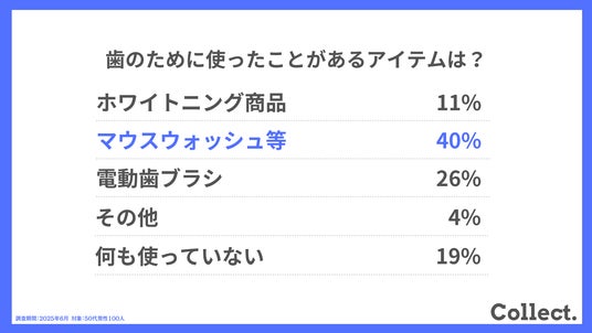 「マウスウォッシュ等(40%)」を筆頭に、「電動歯ブラシ(26%)」「ホワイトニング商品(11%)」が続く結果となりました。マウスウォッシュやホワイトニングなど、手軽に “ながらケア” できる商品が支持を集めているようです。