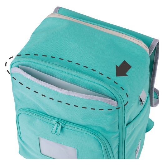 ■前面大ポケット:A4クリアファイルがすっぽりと収納できる大きなポケット。提出物などをスムーズに出し入れできます。中身が出てこないよう開口部にマグネットも付いています。