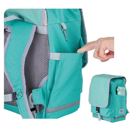 ■両サイドポケット:開口部のゴムでマチが広がるので、水筒や折り畳み傘など厚みがある荷物も収納可能。抜け穴もついているので、雨が降ってもポケット内に水がたまらず安心。