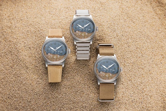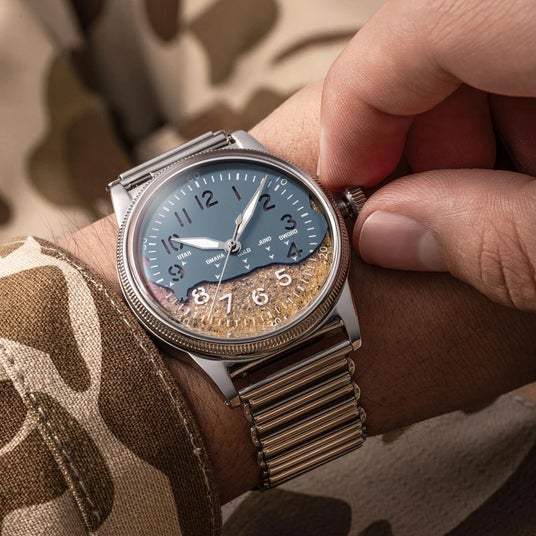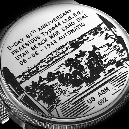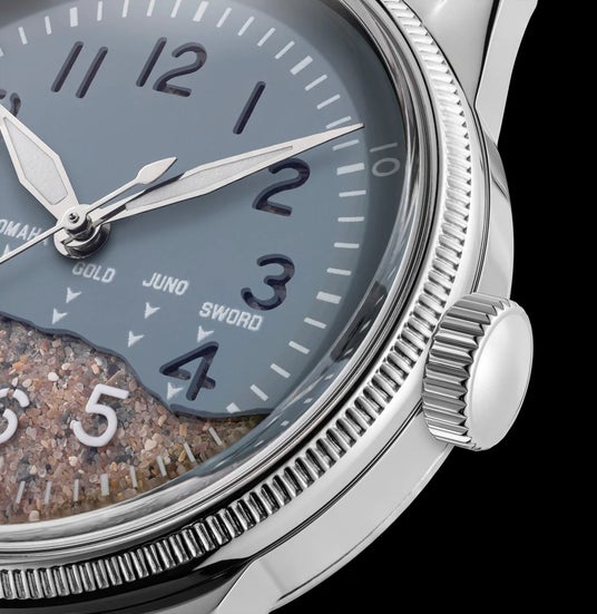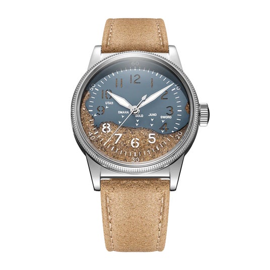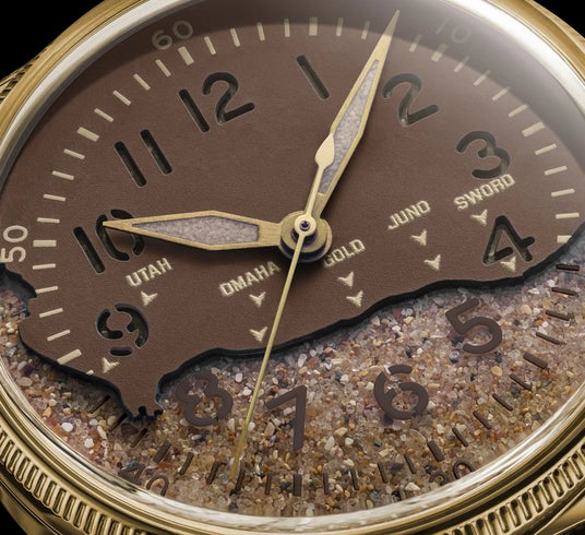 ノルマンディー上陸作戦から81周年を迎え、平和の記念として作られた特別なモデル。最大の特徴は、実際にユタ・ビーチから採取された砂を文字盤に封じ込めたダイヤル。上半分は砂がそのままインデックスとして現れ、下半分にはホワイトの蓄光インデックスを配置。ノルマンディー海岸線をかたどったカットアウトと、5つの上陸地点のマーキングが歴史の記憶を鮮明に刻みます。ケースバックには勇気を象徴するD-Dayの印象的なイメージを刻印。シリアルナンバー入りで、一本ごとに唯一無二の存在感を持たせています。