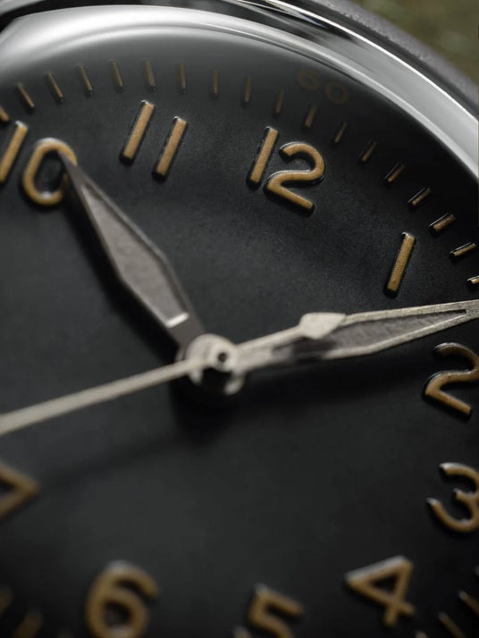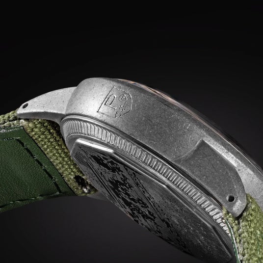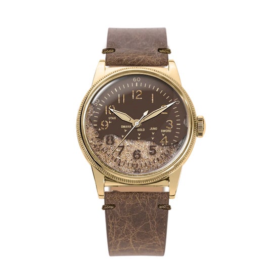 歴史に「着想を得た」時計ではなく、歴史そのものを刻んだ時計。ユタ・ビーチ沖の海に沈めることで自然にエイジングされたケース。かつての牡蠣養殖手法を応用し、塩、太陽、砂に晒されることで、ケースは唯一無二の傷や色合いを宿します。これは人工的な加工ではなく、時と潮が刻んだ自然のパティーナです。文字盤はブラックとブラウンのエイジド仕上げで、インデックスも控えめにデザイン。ケースと文字盤が一体となり、荒波の記憶を伝える特別な一本となっています。