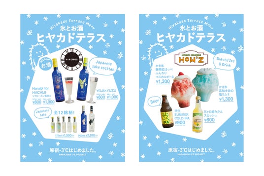 ▼「氷とお酒 ヒヤカドテラス」「ハラカド」7階屋上テラスに、避暑地をイメージしたテラス風のスペースを設置し、夏らしさと涼感を味わえる「氷とお酒 ヒヤカドテラス」を期間限定で開催。オリジナルの-3℃かき氷や日本酒カクテルなど、見た目にも涼しい冷やしグルメを提供します。少しでも体感温度を下げていただけるよう、すだれやベンチ、ミストを設置し、屋外でも過ごしやすい環境をご用意します。