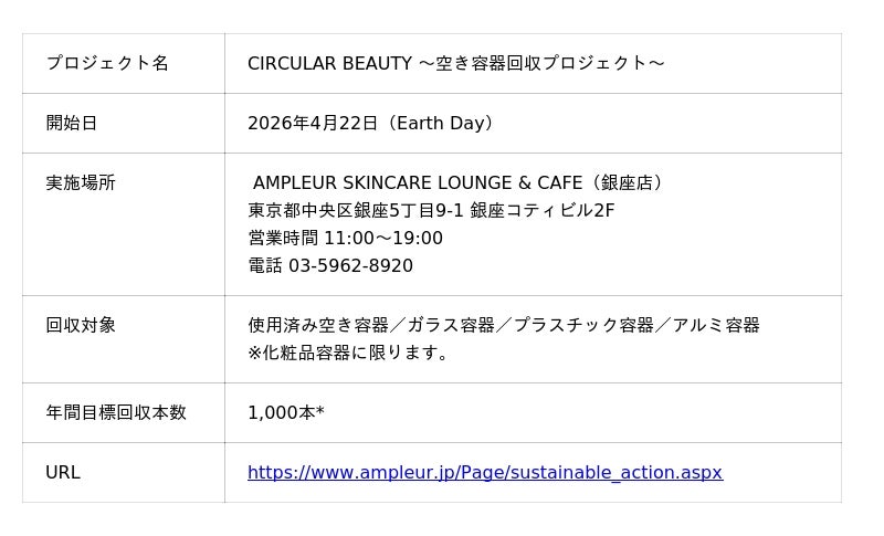 株式会社ハイサイド(本社:東京都目黒区)が展開するクリニカルソリューション・スキンケアブランド「アンプルール」は、2026年4月22日(Earth Day)より、地球環境と美しさの共生をテーマとした循環型美容プロジェクト「AMPLEUR CIRCULAR BEAUTY (空き容器回収プロジェクト)」を、アンプルール 銀座店(AMPLEUR SKINCARE LOUNGE)にて開始いたします。