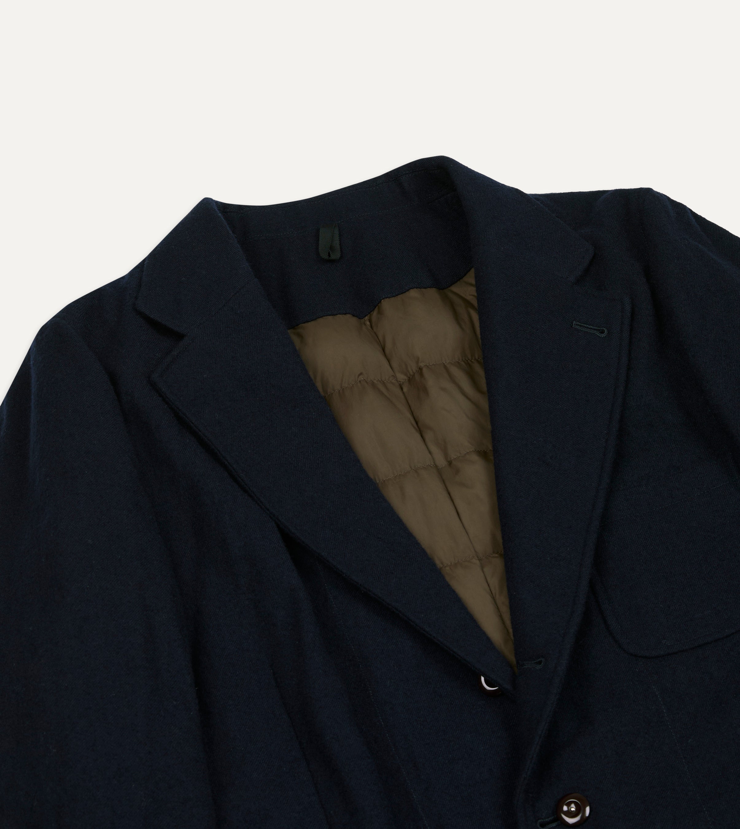 裏地にはスペイン産ダックダウンを封入したナイロンタフタのキルティングを採用し、上品な表情と高い保温性を両立しています。