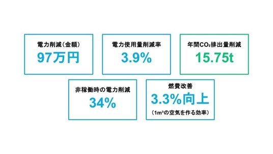 自社開発のデバイスで計測・可視化したデータに基づき、老朽化したコンプレッサーを最適な省エネモデルへ更新。その結果、年間※で97万円の電力コスト削減(および相応のCO2排出量削減)を達成しました。イニシャルコストに捉われず、データ裏付けのある「攻めの省エネ投資」が、具体的な成果として表れています。