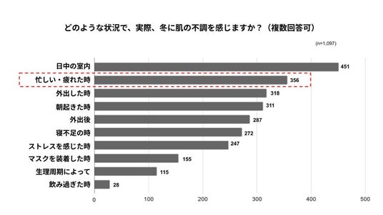 しかし、「肌の不調を感じる状況」についての質問では、約41%に該当する451名が「日中の室内」と回答する一方で、約32%が「忙しい・疲れた時」と回答しており、今回の調査では、冬の肌不調には、乾燥などの外的要因だけでなく、ストレスや疲労といった内的要因も大きく影響していることが分かりました。