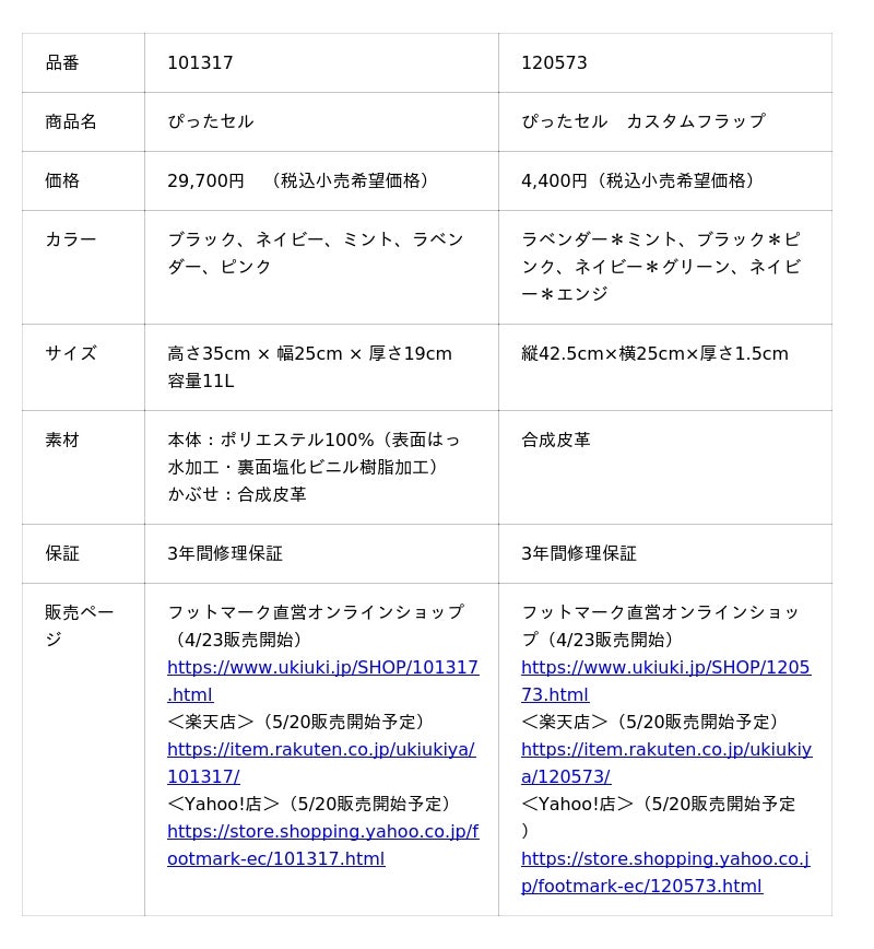 カラーはブラック・ネイビー・ミント・ラベンダー・ピンクの5色展開。サイズは高さ35cm×幅25cm×厚さ19cm(容量11L)、価格は29,700円(税込小売希望価格)。フットマーク直営オンラインショップなどで販売いたします。
