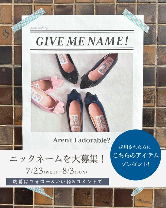 日頃からファルファーレや商品に愛着を持ち可愛がってくださる皆さまと、楽しい企画をしたいと思い考えました。ポインテッドトゥの「ナタリー」と同じ形に、同素材の大きめのエナメルリボンをつけたらとても可愛いバレエシューズが完成したので、一緒にお名前を考えていただけたら商品がお手元に届いた後に、名付け親の方もそうでない方にも可愛がってもらえると嬉しいです。ファルファーレではこれまでにも、今回のようなスポット商品に「ディーン」「ペルル」「ポシェ」「クレール」「アメリ」「メアリ」など可愛い名前をつけていました。